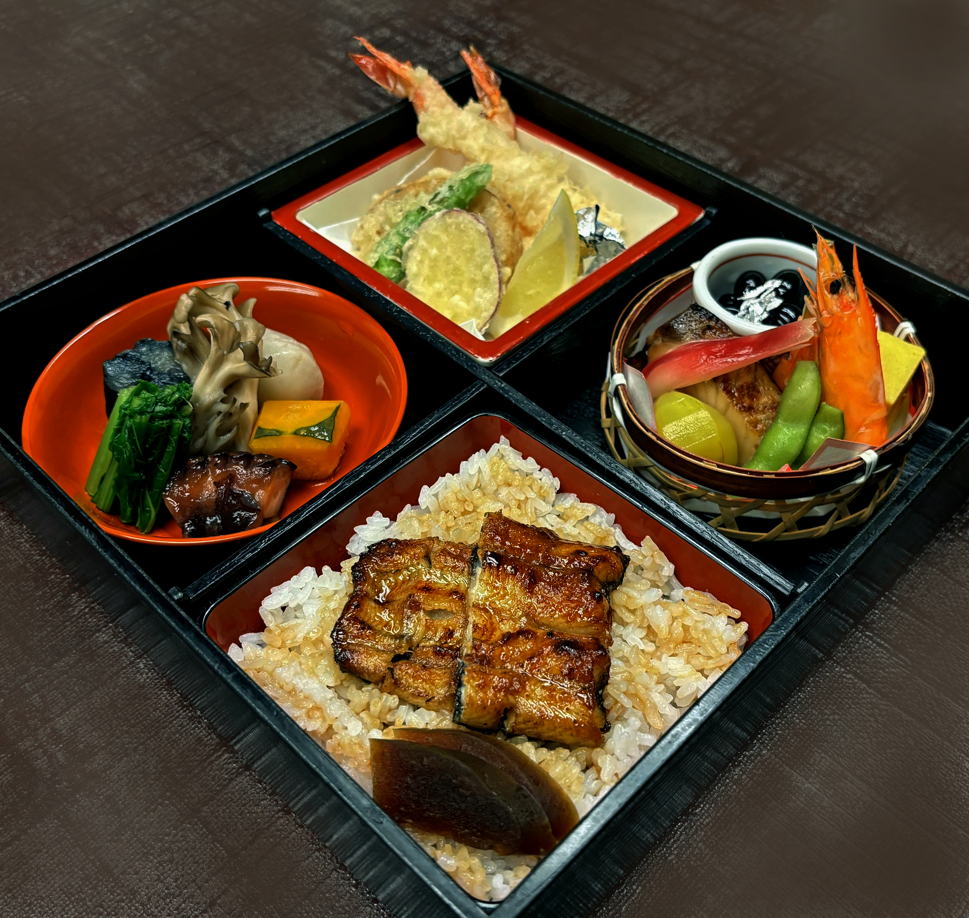 純米大吟醸のしぼりたて新酒と竹葉亭の松花堂弁当鰻ご飯